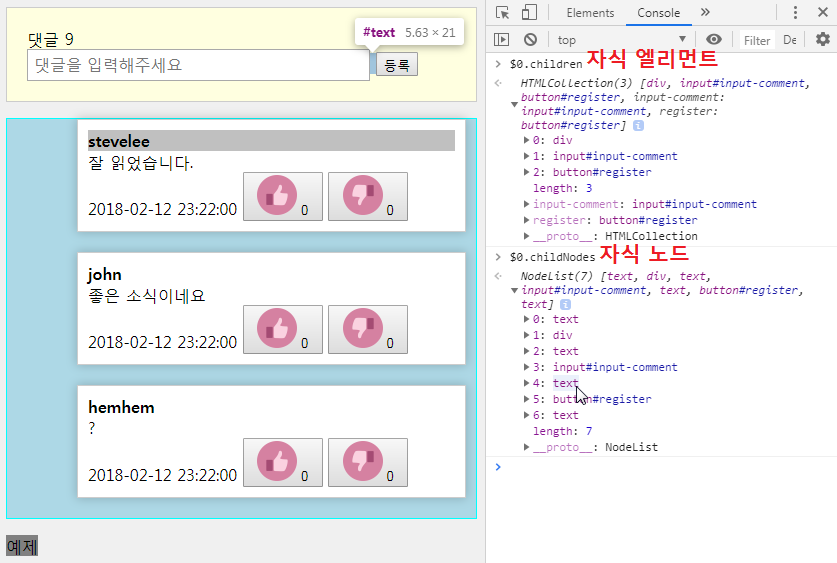 엘리먼트는 화면 상 보이는 것들(div, input, button)만 들어있는 반면, 노드는 엘리먼트의 내용들과 HTML상의 text도 포함되어 있다.