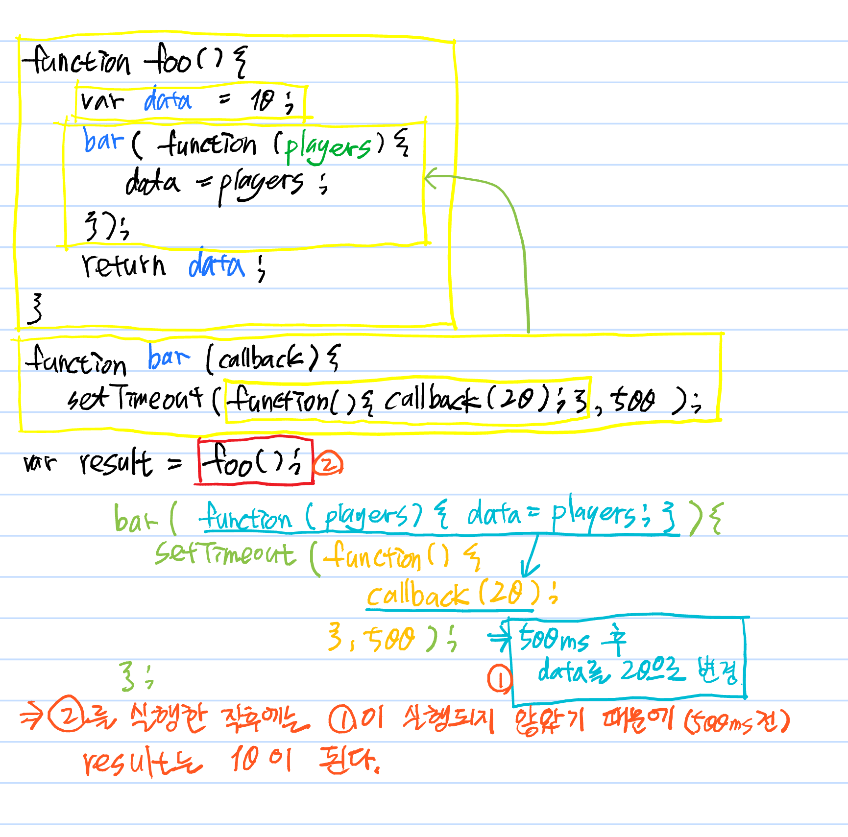 function foo () { var data = 10; bar(function (players) { data = players; console.log("bar in foo's data", data); }); console.log("foo's data", data); return data; } function bar (callback) { setTimeout(callback, 0); } var result = foo(); console.log('result', result);이 코드를 실행했을 경우