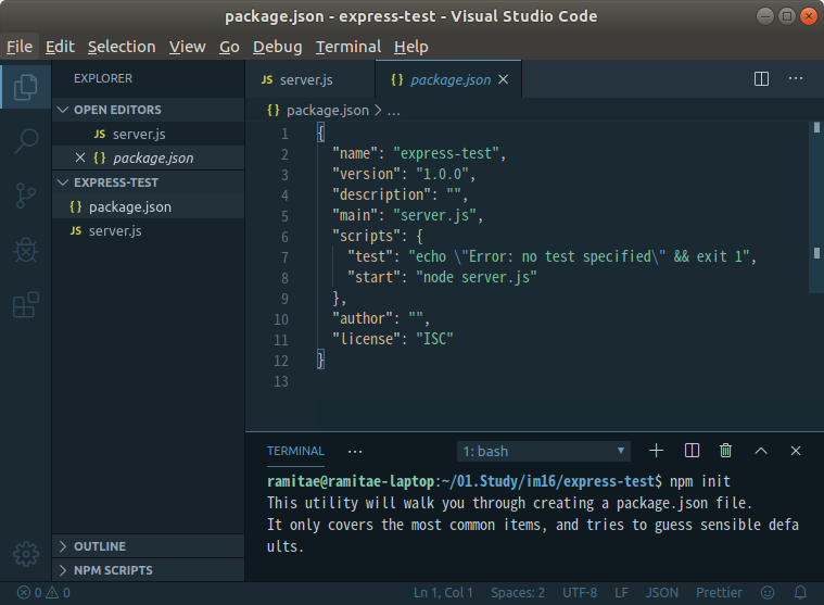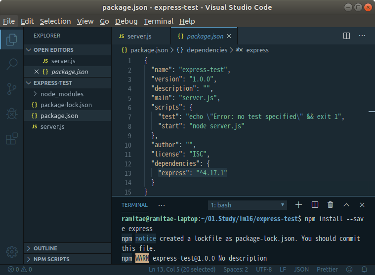 에 사용하는 패키지의 정보가 없으면 안된다. 그럴 경우 $ npm install