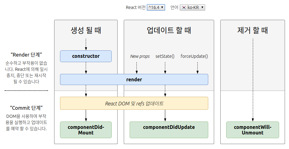 컴포넌트가 브라우저에 보여질 때, 업데이트될 때, 사라질 때 각 단계 전,후로 특정 메서드가 호출된다.