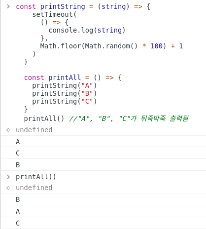 printAll() //"A", "B", "C"가 뒤죽박죽 출력됨